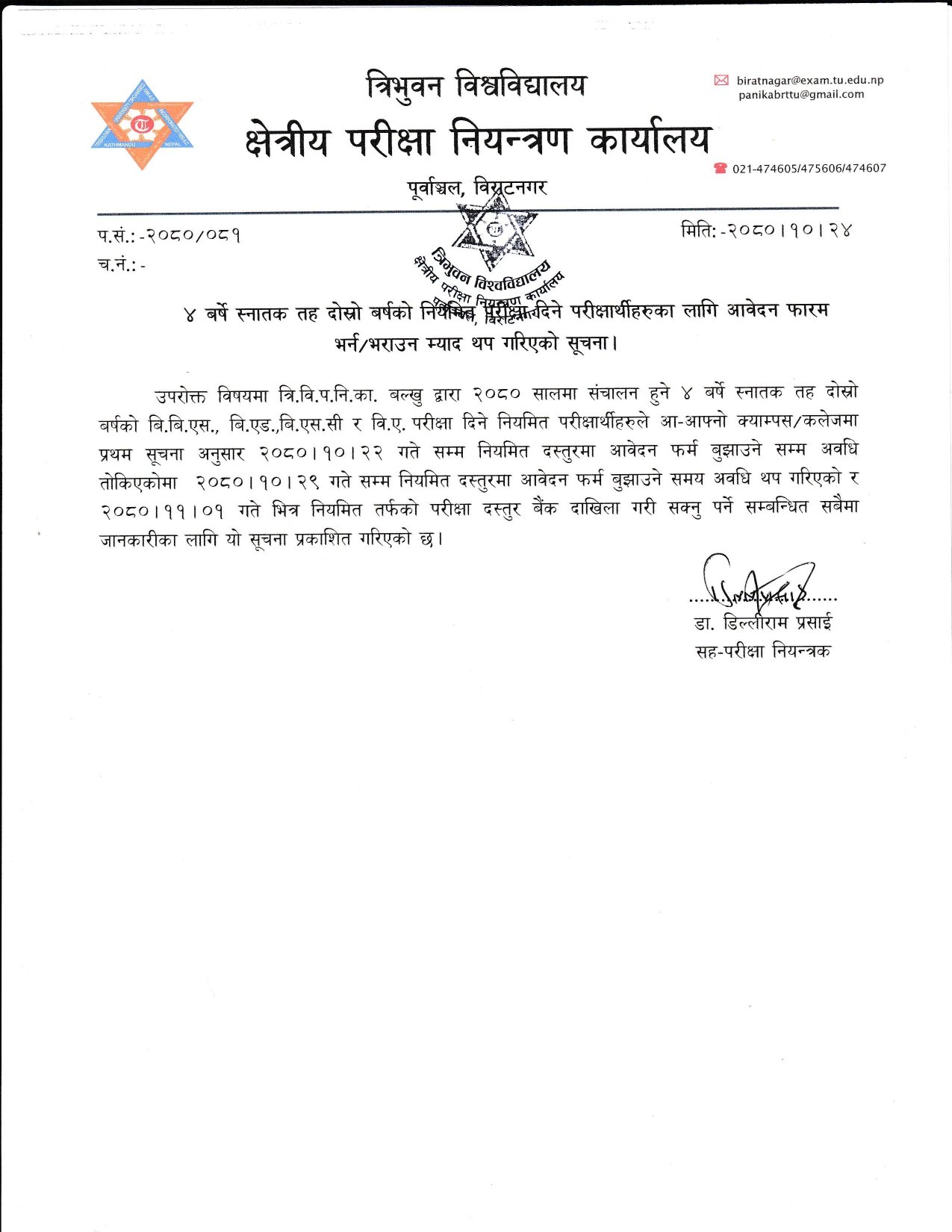 TU 2080-10-25४ बर्षे स्नातक तह दोस्रो बर्षको नियमित परीक्षा दिने परीक्षार्थीहरुका लागि आवेदन फारम भर्न/भराउन म्याद थप गरिएको सूचना।